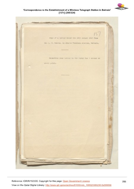 'Correspondence re the Establishment of a Wireless Telegraph Station in Bahrain'