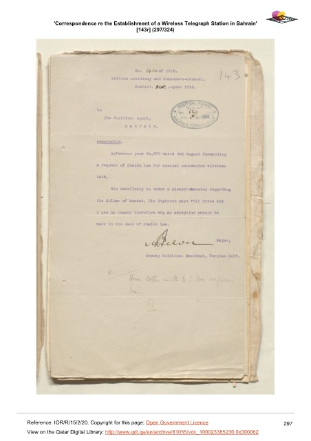 'Correspondence re the Establishment of a Wireless Telegraph Station in Bahrain'