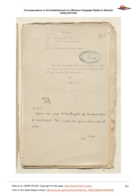 'Correspondence re the Establishment of a Wireless Telegraph Station in Bahrain'