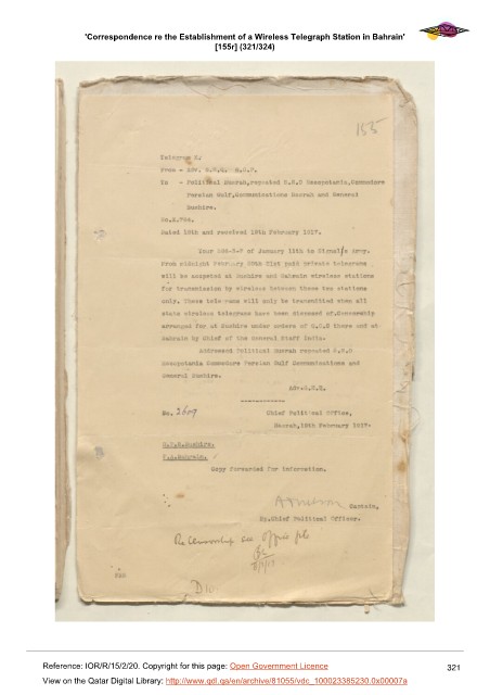 'Correspondence re the Establishment of a Wireless Telegraph Station in Bahrain'