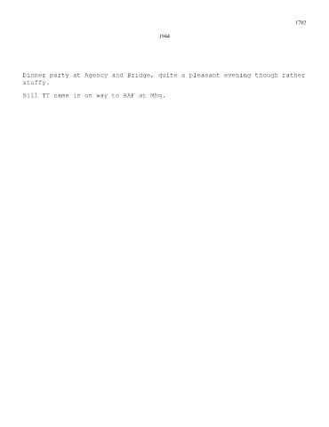 1782 1944 Dinner party at Agency and Bridge, quite a pleasant evening though rather stuffy. Bill TT came in on way to RAF at Mhq.