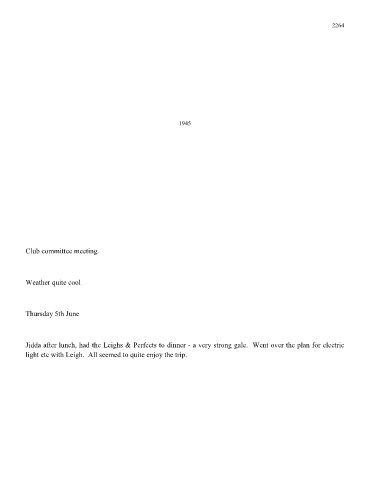 2264 1945 Club committee meeting. Weather quite cool Thursday 5th June Jidda after lunch, had the Leighs & Perfects to dinner - a very strong gale. Went over the plan for electric light etc with Leigh. All seemed to quite enjoy the trip.