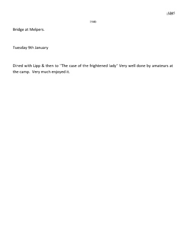 1305 1305 1940 Bridge at Melpers. Tuesday 9th January Dined with Lipp & then to "The case of the frightened lady" Very well done by amateurs at the camp. Very much enjoyed it.