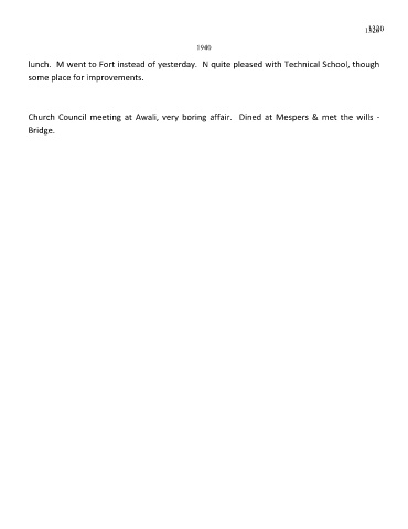 1320 1320 1940 lunch. M went to Fort instead of yesterday. N quite pleased with Technical School, though some place for improvements. Church Council meeting at Awali, very boring affair. Dined at Mespers & met the wills - Bridge.