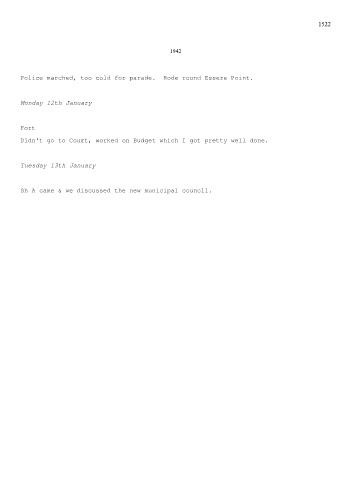 1522 1942 Police marched, too cold for parade. Rode round Essere Point. Monday 12th January Fort Didn't go to Court, worked on Budget which I got pretty well done. Tuesday 13th January Sh A came & we discussed the new municipal council.