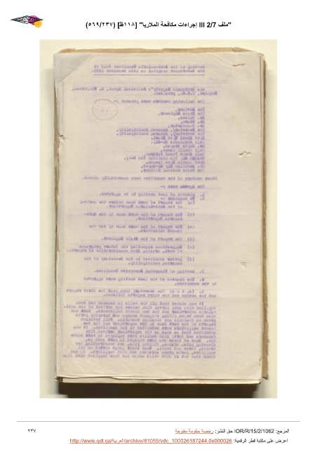 (٥٦٩/٢٣٧) [ﻅ١١٨] "ﺎﻳﺭﻼﻤﻟا ﺔﺤﻓﺎﻜﻣ ﺕاءاﺮﺟﺇ III 2/7 ﻒﻠﻣ" ٢٣٧ ﺔﺣﻮﺘﻔﻣ ﺔﻣﻮﻜﺣ ﺔﺼﺧﺭ :ﺮﺸﻨﻟا ﻖﺣ IOR/R/15/2/1062 :ﻊﺟﺮﻤﻟا http://www.qdl.qa/ﺔﻴﺑﺮﻌﻟا/archive/81055/vdc_100026187244.0x000026 :ﺔﻴﻤﻗﺮﻟا ﺮﻄﻗ ﺔﺒﺘﻜﻣ ﻰﻠﻋ ﺽﺮﻋا