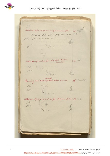 (٥٦٩/٥٢١) [ﻅ٢٦٠] "ﺎﻳﺭﻼﻤﻟا ﺔﺤﻓﺎﻜﻣ ﺕاءاﺮﺟﺇ III 2/7 ﻒﻠﻣ" ٥٢١ ﺔﺣﻮﺘﻔﻣ ﺔﻣﻮﻜﺣ ﺔﺼﺧﺭ :ﺮﺸﻨﻟا ﻖﺣ IOR/R/15/2/1062 :ﻊﺟﺮﻤﻟا http://www.qdl.qa/ﺔﻴﺑﺮﻌﻟا/archive/81055/vdc_100026187245.0x00007a :ﺔﻴﻤﻗﺮﻟا ﺮﻄﻗ ﺔﺒﺘﻜﻣ ﻰﻠﻋ ﺽﺮﻋا