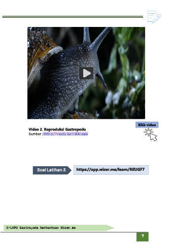 Klik video Video 2. Reproduksi Gastropoda Sumber : https://youtu.be/pIiiAljoais Soal Latihan 3 https://app.wizer.me/learn/REUGF7 E-LKPD Gastropoda Berbantuan Wizer.me 7