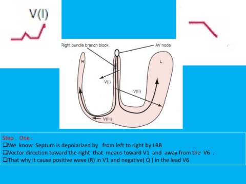 Step . One : We know Septum is depolarized by from left to right by LBB Vector direction toward the right that means toward V1 and away from the V6 . That why it cause positive wave (R) in V1 and negative( Q ) in the lead V6