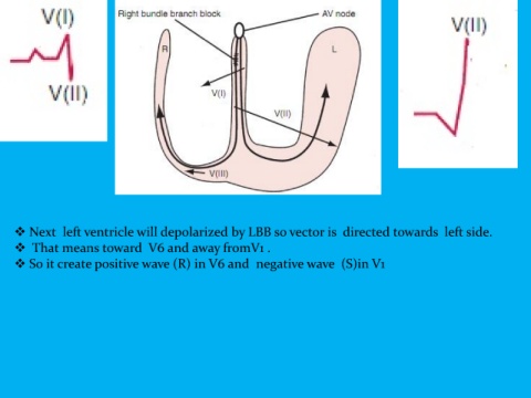 Next left ventricle will depolarized by LBB so vector is directed towards left side. That means toward V6 and away fromV1 . So it create positive wave (R) in V6 and negative wave (S)in V1