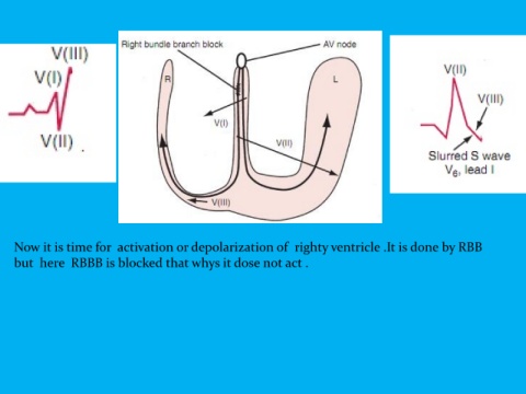 Now it is time for activation or depolarization of righty ventricle .It is done by RBB but here RBBB is blocked that whys it dose not act .