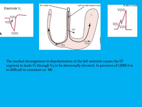 The marked derangement in depolarization of the left ventricle causes the ST segment in leads V1 through V4 to be abnormally elevated. In presence of LBBB it is to difficult to comment on MI .
