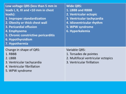 Low voltage QRS (less than 5 mm in Wide QRS: