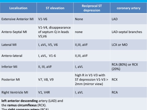 Lateral MI I, aVL, V5, V6 II,III, aVF LCX or MO