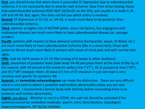 Eighth, see above. Whether or not it is STEMI, the cath lab should be activated if the