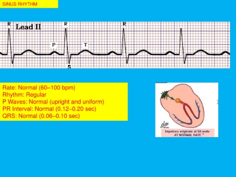 SINUS RHYTHM Rate: Normal (60–100 bpm) Rhythm: Regular P Waves: Normal (upright and uniform) PR Interval: Normal (0.12–0.20 sec) QRS: Normal (0.06–0.10 sec)