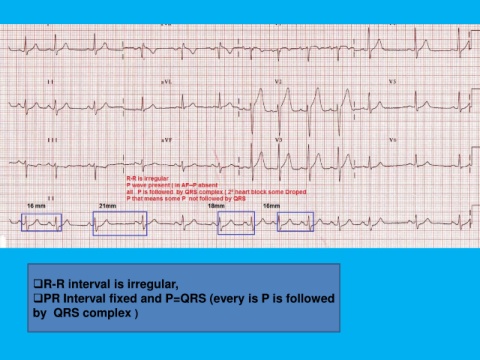 R-R interval is irregular, PR Interval fixed and P=QRS (every is P is followed by QRS complex )