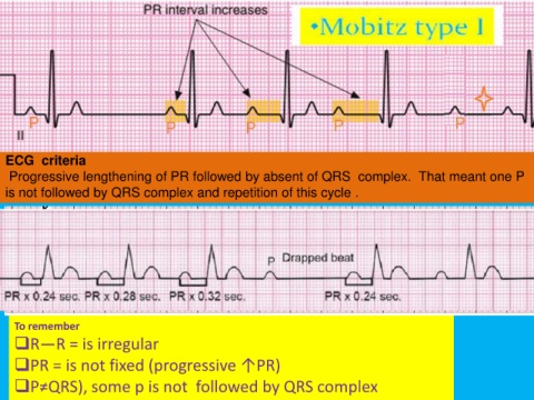 Progressive lengthening of PR followed by absent of QRS complex. That meant one P