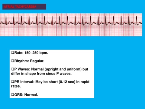 ATRIAL TACHYCARDIA Rate: 150–250 bpm. Rhythm: Regular. P Waves: Normal (upright and uniform) but differ in shape from sinus P waves. PR Interval: May be short (0.12 sec) in rapid rates. QRS: Normal.