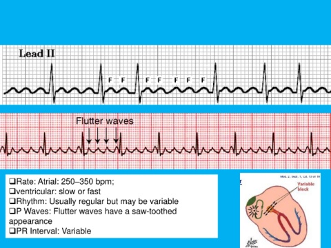 Rate: Atrial: 250–350 bpm; ventricular: slow or fast Rhythm: Usually regular but may be variable P Waves: Flutter waves have a saw-toothed appearance PR Interval: Variable