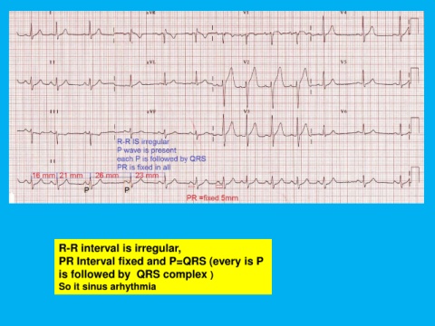R-R interval is irregular, PR Interval fixed and P=QRS (every is P is followed by QRS complex ) So it sinus arhythmia