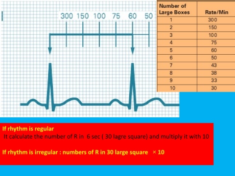 If rhythm is regular It calculate the number of R in 6 sec ( 30 lagre square) and multiply it with 10 If rhythm is irregular : numbers of R in 30 large square × 10