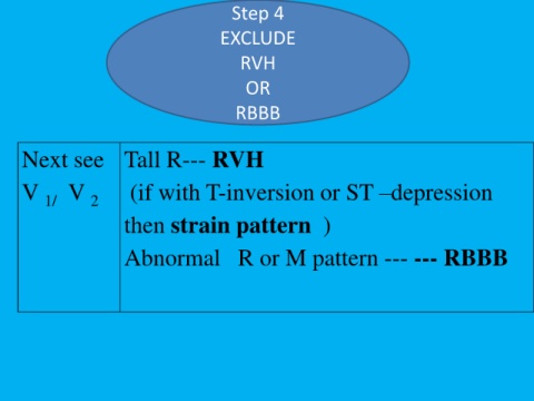 Step 4 EXCLUDE RVH OR RBBB Next see Tall R--- RVH V V 2 (if with T-inversion or ST –depression 1/ then strain pattern ) Abnormal R or M pattern --- --- RBBB
