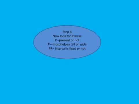 Step 8 Now look for P wave P –present or not P—morphology tall or wide PR– interval is fixed or not