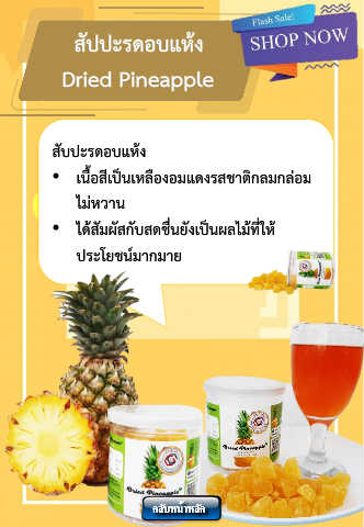 สัปปะรดอบแห้ง Dried Pineapple สับปะรดอบแห้ง • เนื้อสีเป็นเหลืองอมแดงรสชาติกลมกล่อม ไม่หวาน • ได้สัมผัสกับสดชื่นยังเป็นผลไม้ที่ให้ ประโยชน์มากมาย