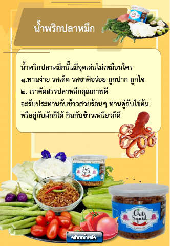 น้ าพริกปลาหมึก น้ าพริกปลาหมึกนั้นมีจุดเด่นไม่เหมือนใคร 1.ทานง่าย รสเด็ด รสชาติอร่อย ถูกปาก ถูกใจ 2. เราคัดสรรปลาหมึกคุณภาพดี จะรับประทานกับข้าวสวยร้อนๆ ทานคู่กับไข่ต้ม หรือคู่กับผักก็ได้ กินกับข้าวเหนียวก็ดี