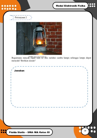 Pertanyaan 2 Sumber: https://bit.ly/3ejCxdy Bagaimana minyak dapat naik ke atas melalui sumbu lampu sehingga lampu dapat menyala? Berikan alasan? Jawaban 35