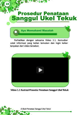24 Ayo Memahami Masalah Perhatikan dengan seksama Video 1.1. Kemudian catat informasi yang kalian temukan dan ingin kalian tanyakan dari video tersebut. Video 1.1 Ilustrasi Prosedur Penataan Sanggul Ukel Tekuk E-Book Penataan Sanggul Ukel Tekuk