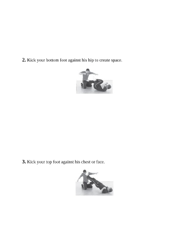 2. Kick your bottom foot against his hip to create space. 3. Kick your top foot against his chest or face.