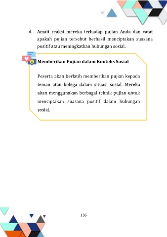 d. Amati reaksi mereka terhadap pujian Anda dan catat