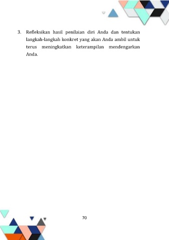 3. Refleksikan hasil penilaian diri Anda dan tentukan langkah-langkah konkret yang akan Anda ambil untuk terus meningkatkan keterampilan mendengarkan Anda. 70