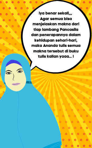 iya benar sekali,,, Agar semua bisa menjelaskan makna dari tiap lambang Pancasila dan penerapannya dalam kehidupan sehari-hari, maka Ananda tulis semua makna tersebut di buku tulis kalian yaaa... !