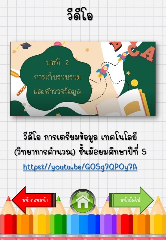 วีดีโอ วีดีโอ กำรเตรียมข้อมูล เทคโนโลยี (วิทยำกำรค ำนวณ) ชั้นมัธยมศึกษำปีที่ 5 https://youtu.be/G05g7QP0y7A หน้ำก่อนหน้ำ หน้ำถัดไป