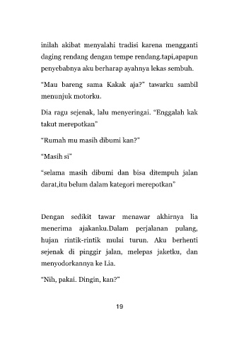 Dia ragu sejenak, lalu menyeringai. “Enggalah kak