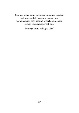 Jadi jika kelak kamu membaca ini dalam keadaan hati yang sudah tak sama, izinkan aku mengucapkan satu kalimat sederhana, dengan semua cinta yang pernah ada: Semoga kamu bahagia, Liaa” 37
