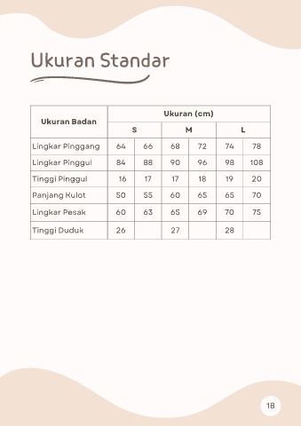 Ukuran Standar Ukuran (cm) Ukuran Badan S M L Lingkar Pinggang 64 66 68 72 74 78 Lingkar Pinggul 84 88 90 96 98 108 Tinggi Pinggul 16 17 17 18 19 20 Panjang Kulot 50 55 60 65 65 70 Lingkar Pesak 60 63 65 69 70 75 Tinggi Duduk 26 27 28 18