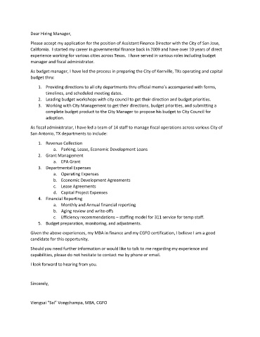 Please accept my application for the position of Assistant Finance Director with the City of San Jose,