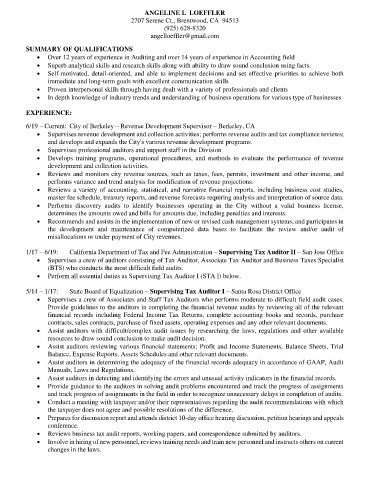 1/17 – 6/19: California Department of Tax and Fee Administration – Supervising Tax Auditor II – San Jose Office