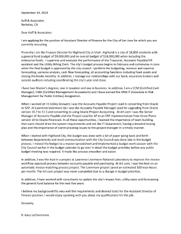 I am applying for the position of Assistant Director of Finance for the City of San Jose for which you are