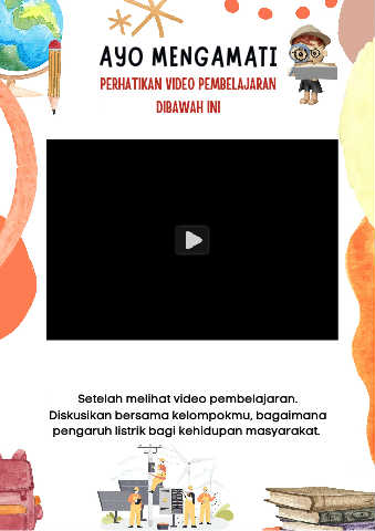 AYO MENGAMATI PERHATIKAN VIDEO PEMBELAJARAN DIBAWAH INI Setelah melihat video pembelajaran. Diskusikan bersama kelompokmu, bagaimana pengaruh listrik bagi kehidupan masyarakat.