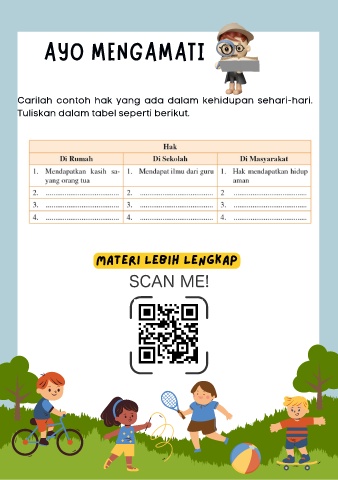 AYO MENGAMATI Carilah contoh hak yang ada dalam kehidupan sehari-hari. Tuliskan dalam tabel seperti berikut. MATERI LEBIH LENGKAP
