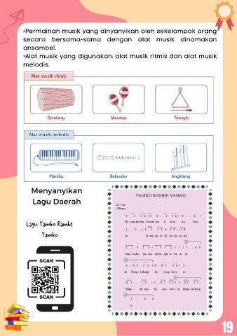 •Permainan musik yang dinyanyikan oleh sekelompok orang secara bersama-sama dengan alat musik dinamakan ansambel. •Alat musik yang digunakan: alat musik ritmis dan alat musik melodis. Menyanyikan Lagu Daerah Lagu Yamko Rambe Yamko 19