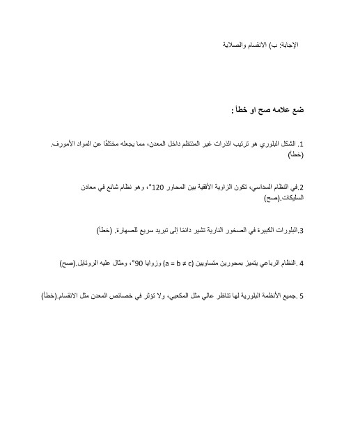 . 5جمٌع الأنظمة البلورٌة لها تناظر عالً مثل المكعبً ،ولا تؤثر فً خصائص المعدن مثل الانمسام(.خطأ)