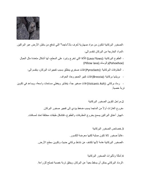 -الصخور البركانٌة تتكون من مواد صهارٌة تُعرف بالـ"ماجما" التً تندفع من باطن الأرض عبر البراكٌن.