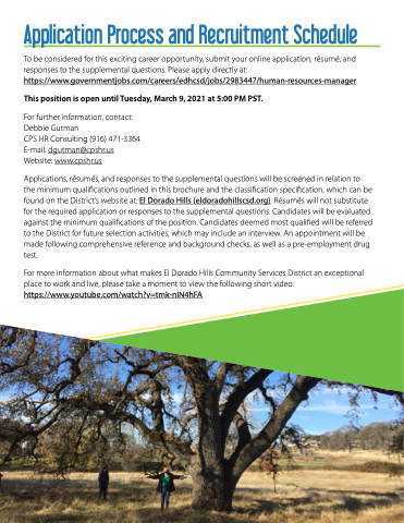 CPS HR Consulting (916) 471-3364 E-mail: dgutman@cpshr us Website: www cpshr us Applications résumés and responses to to the supplemental questions will be screened in relation to to the the minimum qualifications outlined in in in this brochure and the the classification specification which can be found on the District’s website at: El Dorado Hills (eldoradohillscsd org) Résumés will not substitute for the the required application or or responses to the the supplemental questions Candidates will be evaluated against the the minimum qualifications of the the position Candidates deemed most qualified will be referred to the District for future selection activities which may include an interview An appointment will be made following comprehensive reference and background checks as as well as as a a a a a a pre-employment drug test For more information about what makes El Dorado Hills Community Services District an exceptional place to to work and live please take a a a a a moment to to view the following short video: https://www youtube com/watch?v=tmk-nIN4hFA