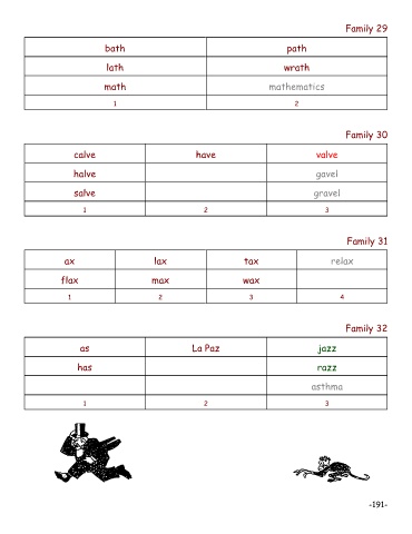 Family 29 bath path lath wrath math mathematics 1 2 Family 30 calve have valve halve gavel salve gravel 1 2 3 Family 31 ax lax tax relax flax max wax 1 2 3 4 Family 32 as La Paz jazz has razz asthma 1 2 3 -191-
